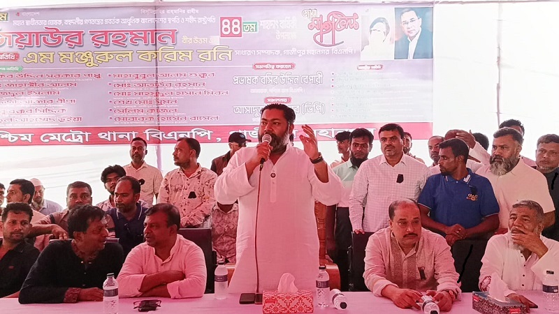 মঙ্গলবার (৩ জুন) দুপুরে মহান স্বাধীনতার ঘোষক, বহুদলীয় গণতন্ত্রের প্রবর্তক আধুনিক বাংলাদেশের স্হপতি ও শহীদ রাষ্ট্রপতি জিয়াউর রহমান এর ৪৪ তম শাহাদাত বার্ষিক উপলক্ষে টঙ্গী পশ্চিম থানা বিএনপির আয়োজনে, দেওরা মুদাফা সরকারি প্রাথমিক বিদ্যালয় মাঠে,আলোচনা ও দোয়া মাহফিল অনুষ্ঠানে প্রধান অতিথির বক্তব্য তিনি এসব কথা বলেন।
